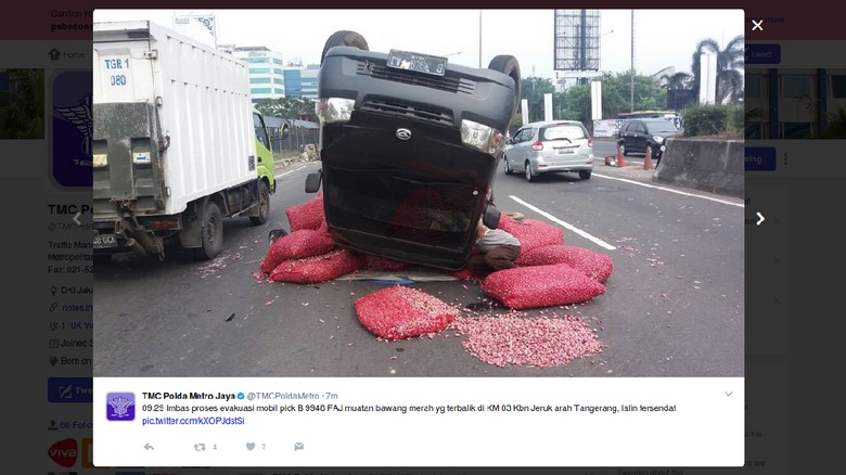 Dari akun twitter resmi Traffic Management Center (TMC) Polda Metro Jaya mobil berwarna hitam tersebut tengah dalam penanganan petugas. Muatan bawang merah dari mobil bernomor polisi B 9948 FAJ tersebut masih berceceran di jalan tol.